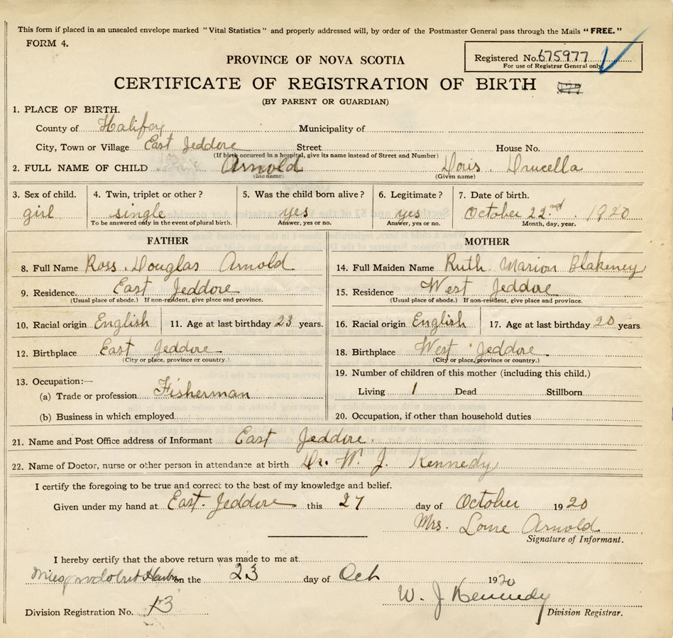 21. Name and Post Office address of Informant Mrs Lorne Arnold East Jeddore