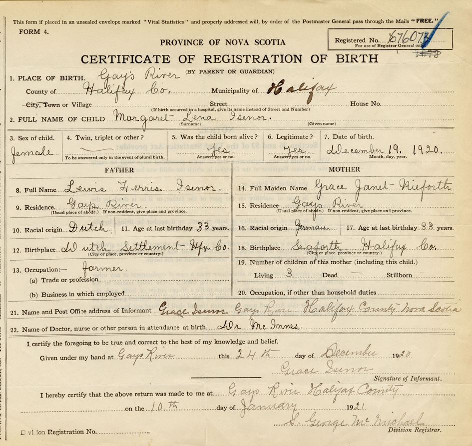 21. Name and Post Office address of Informant Grace Isenor Gays River