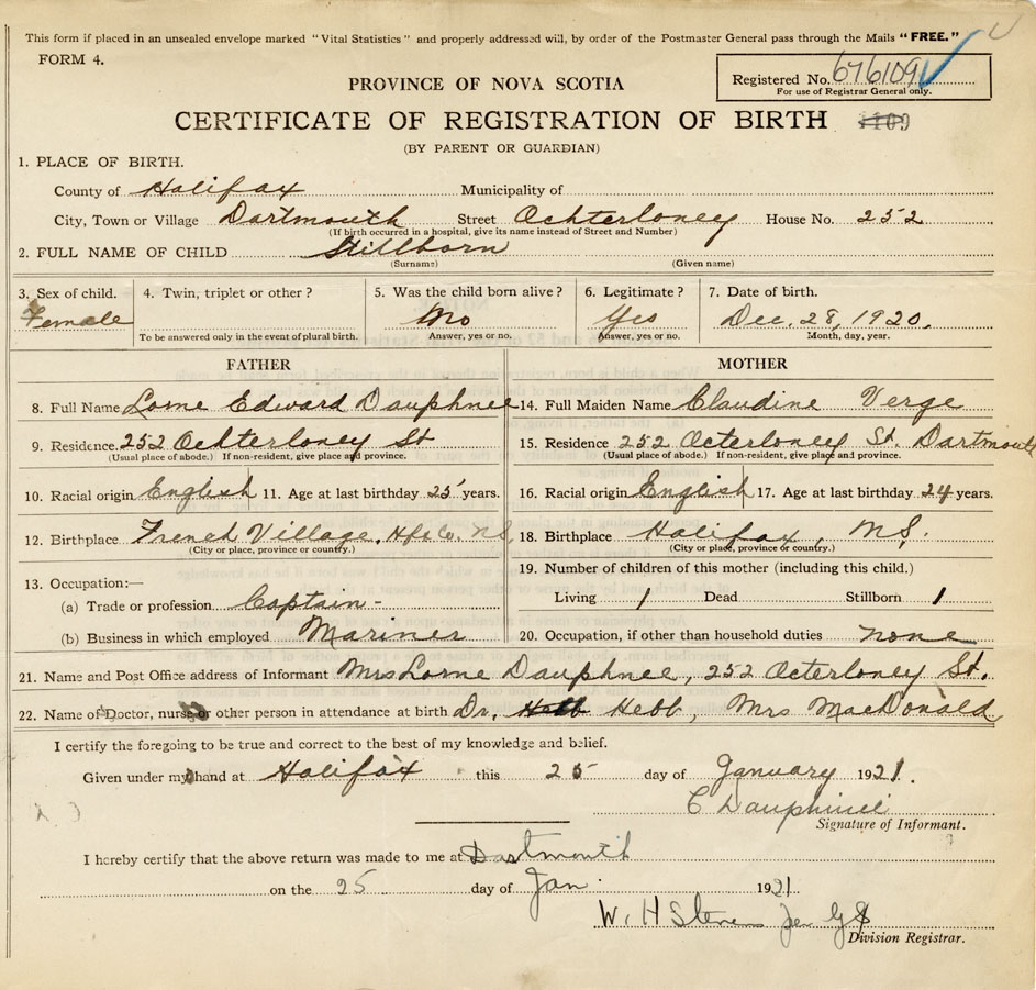 21. Name and Post Office address of Informant Mrs. Lorne Dauphinee 252 Ochterloney St. Dartmouth