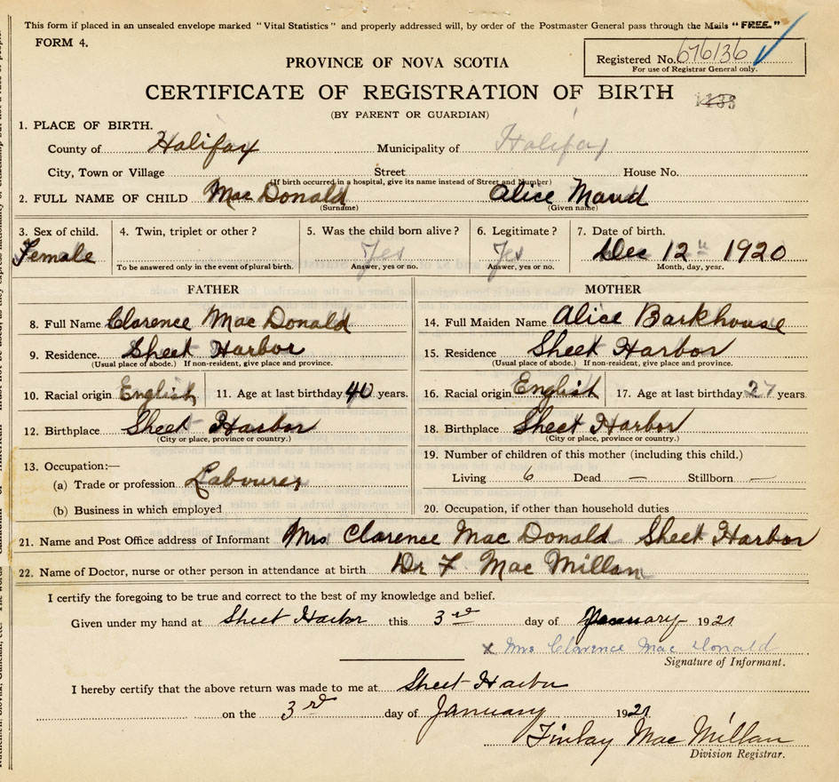 21. Name and Post Office address of Informant Mrs. Clarence MacDonald Sheet Harbour