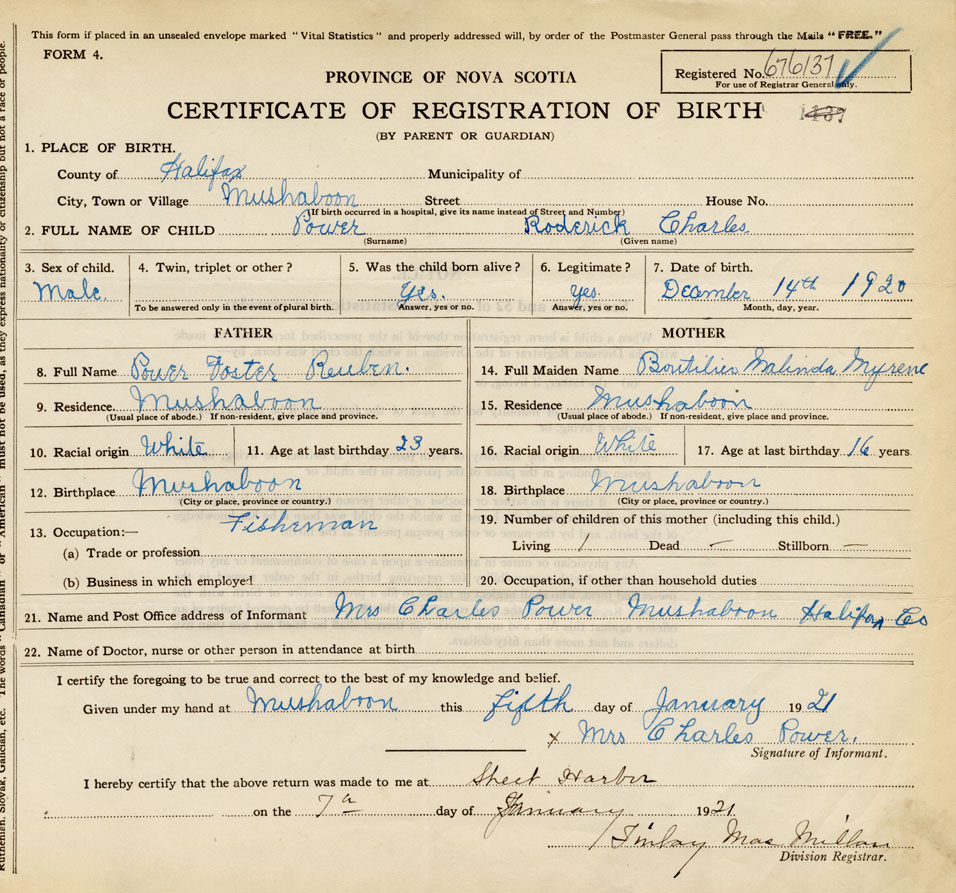 21. Name and Post Office address of Informant Mrs. Charles Power Mushaboom, Halifax Co.