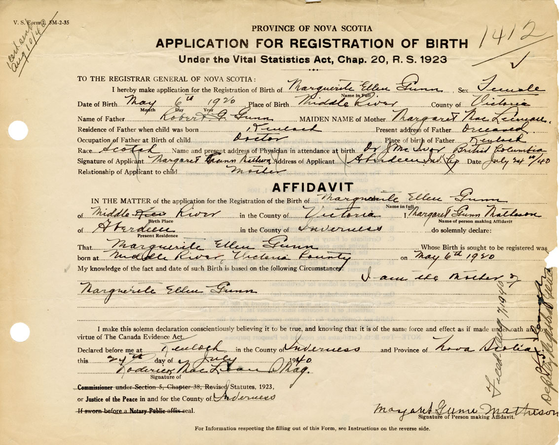 IN THE MATTER of the application for the Registration of the Birth of Marguerite EllenGunn