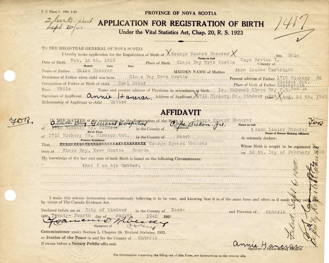 Residence of Father when child was born Glace Bay, Cape Breton Co. Present address of Father 1712 Hickory Road, Windsor, Ontario
