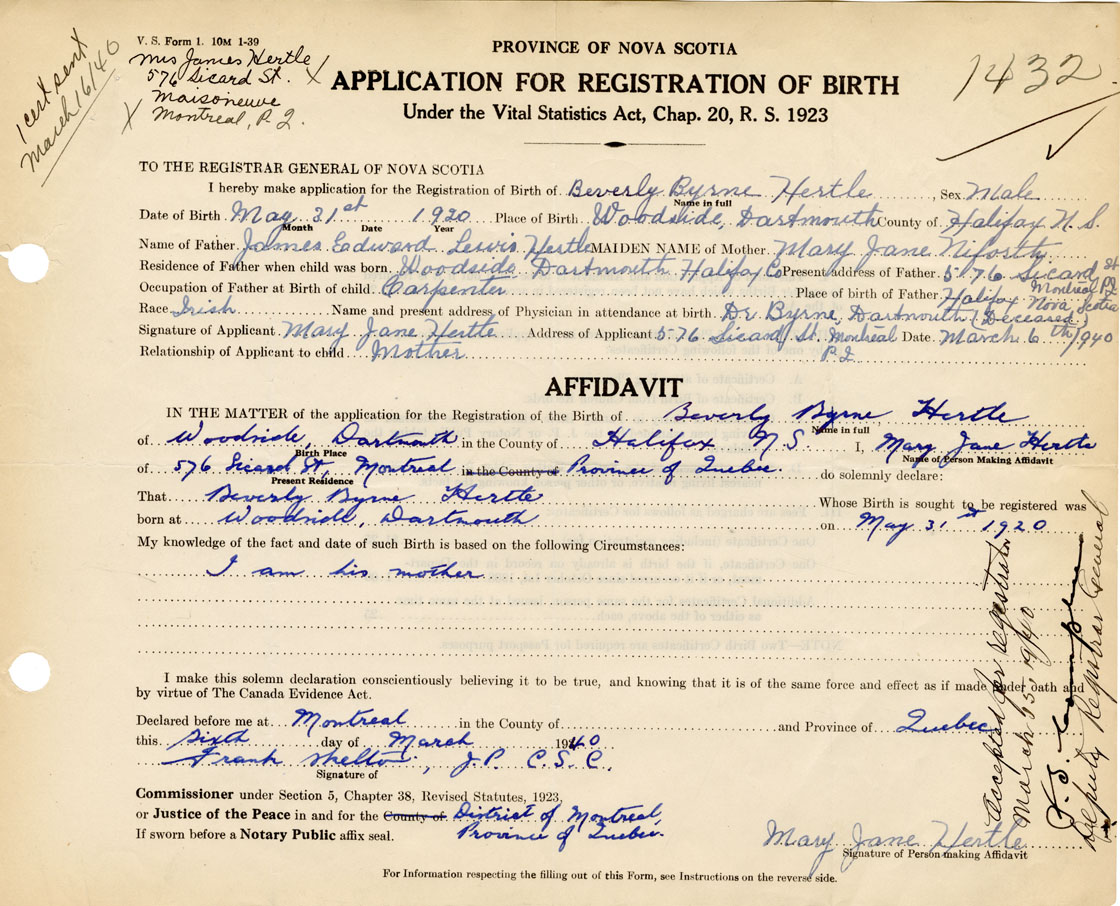 Signature of Applicant Mary Jane Hertle Address of Applicant 576 Sicard Street, Montreal, Quebec Date 6 March 1940