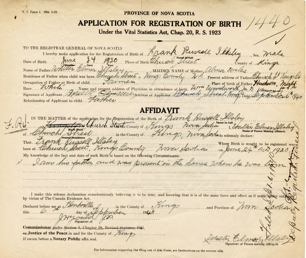 I hereby make application for the Registration of Birth of Frank RussellIllsley Sex Male