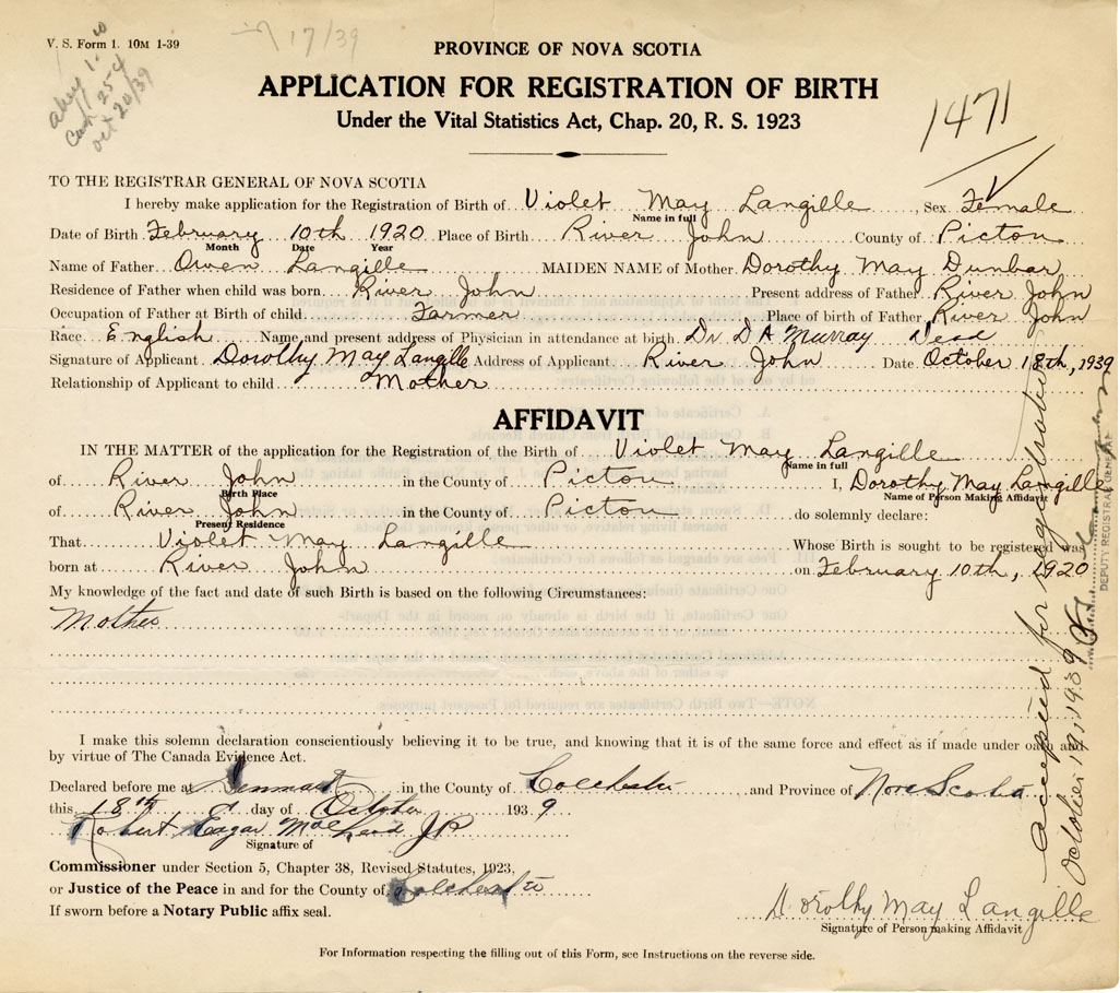 I hereby make application for the Registration of Birth of Violet MayLangille Sex Female