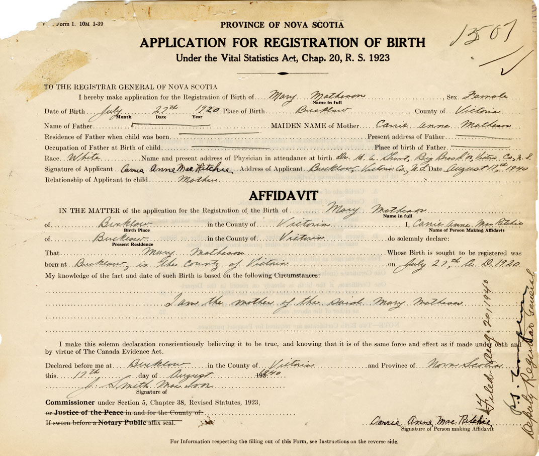 IN THE MATTER of the application for the Registration of the Birth of Mary Matheson