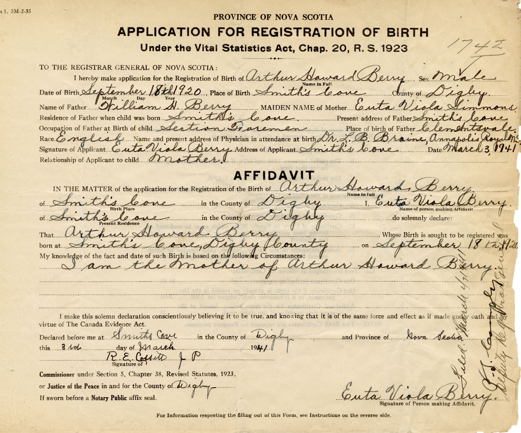 Date of Birth September 18, 1920 Place of Birth Smiths CoveCounty of Digby