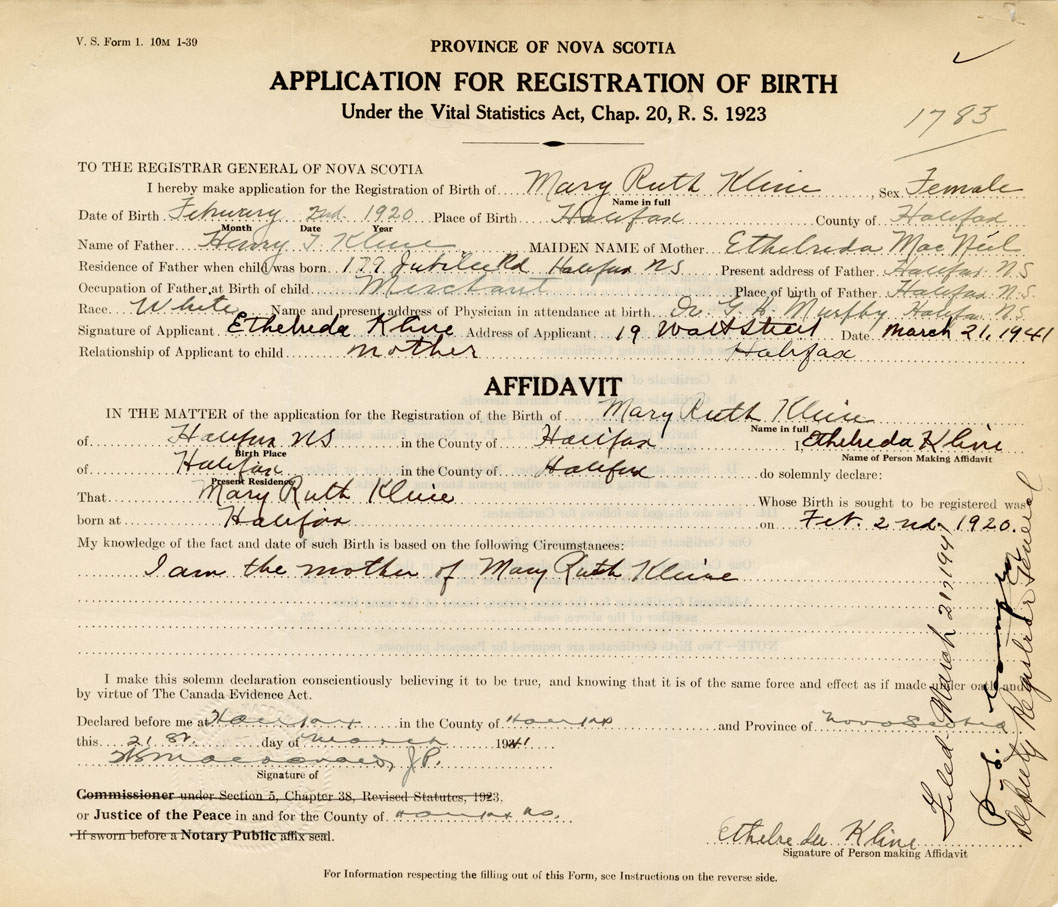I hereby make application for the Registration of Birth of Mary RuthKline Sex Female