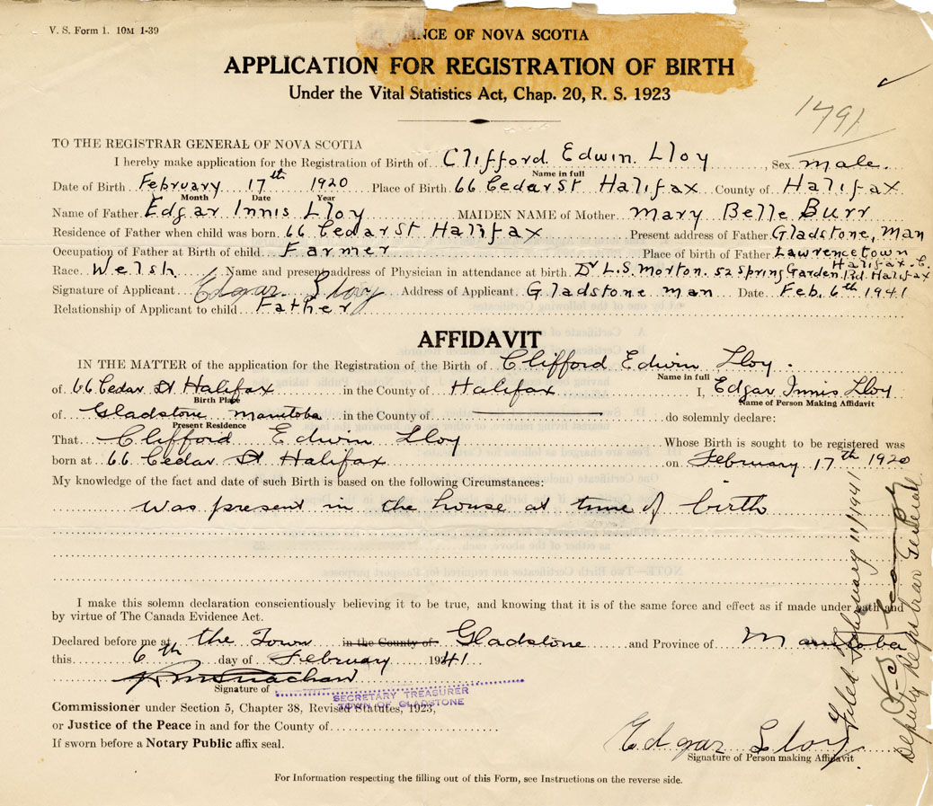 Signature of Applicant Edgar Lloy Address of Applicant Gladstone, Manitoba Date 6 February 1941