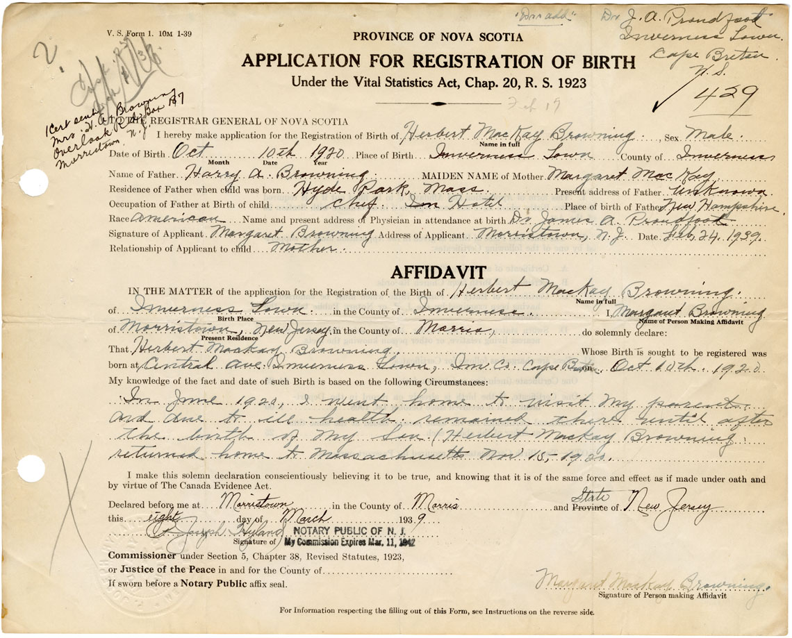 That Herbert MacKayBrowning Whose Birth is sought to be registered was