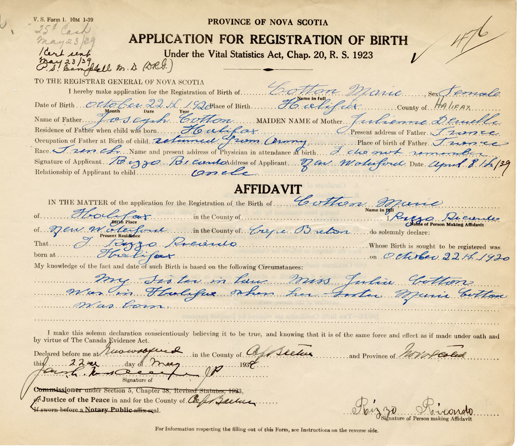 I hereby make application for the Registration of Birth of MarieCotton Sex Female