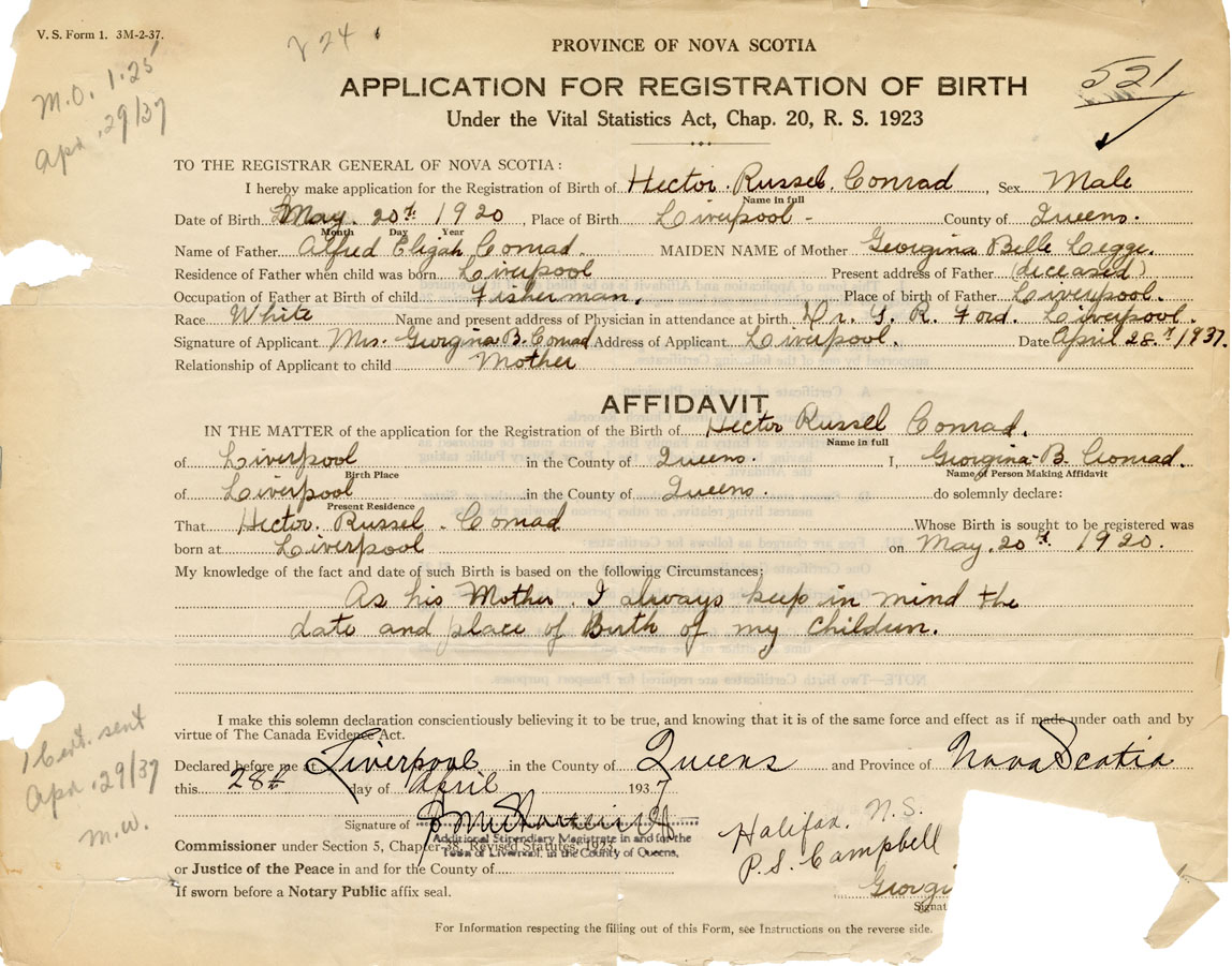 I hereby make application for the Registration of Birth of Hector RusselConrad Sex Male