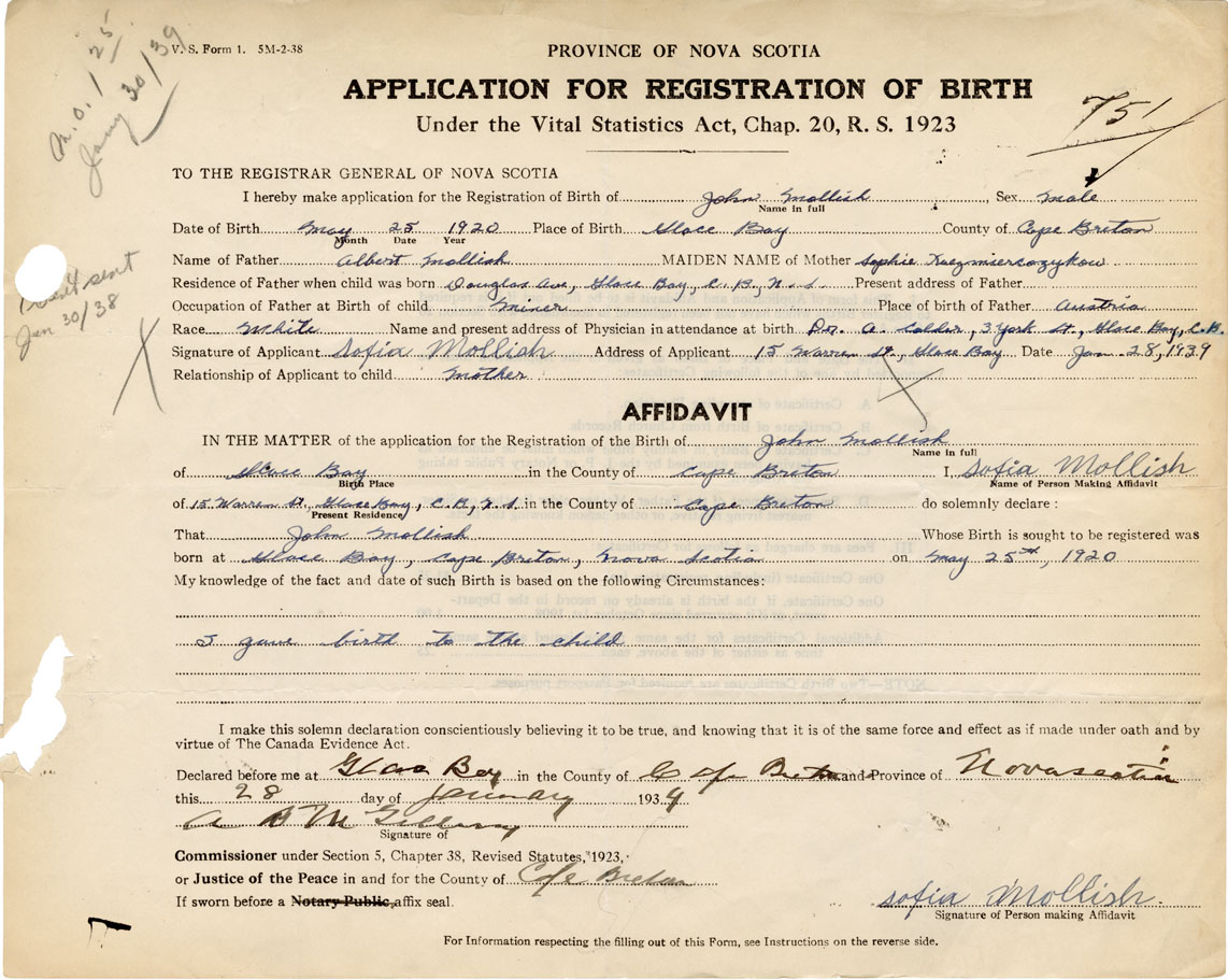 Signature of Applicant Sofia Mollish Address of Applicant 15 Warren St. Glace Bay Date January 28, 1939