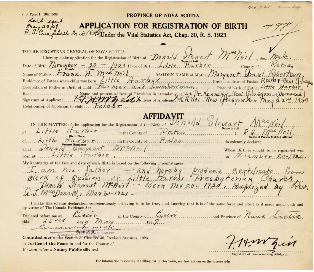 I am his father - and hereby produce certificate from clerk of session of Little Harbour Presbyterian Church. Donald Stewart MacNeil - born November 20 - 1920. Baptized by Rev. A.J. MacDonald, March 30, 1921 -