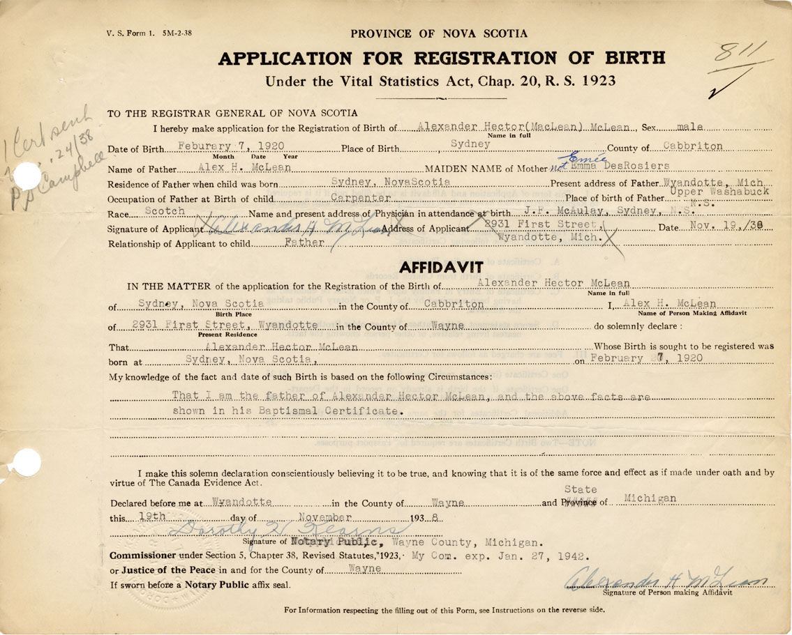 Name of Father Alex H. McLean MAIDEN NAME of Mother Emee DesRosiers