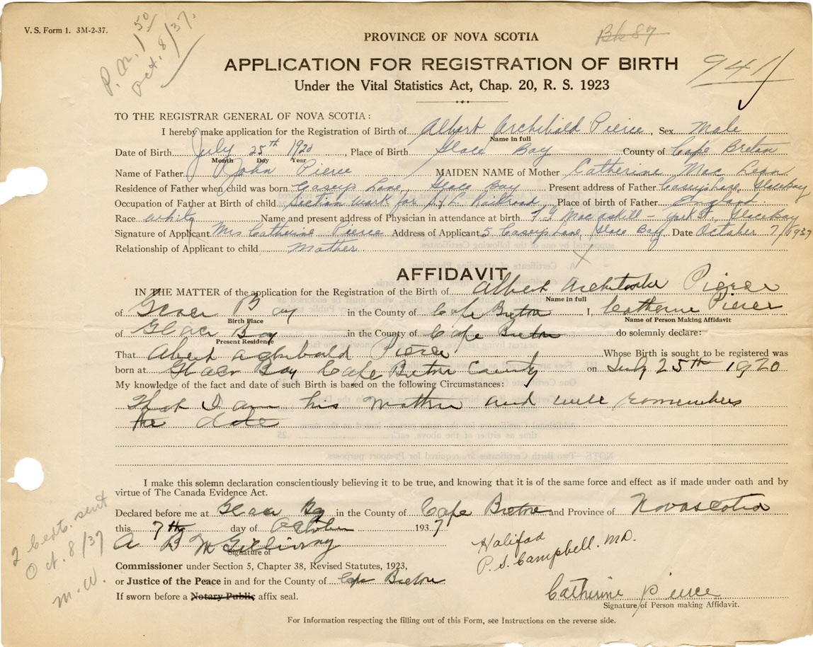 Date of Birth July 25, 1920 Place of Birth Glace BayCounty of Cape Breton