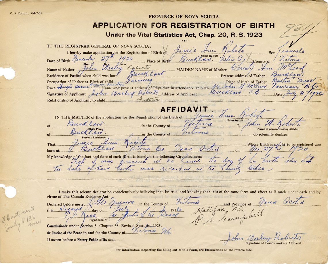 Signature of Applicant John Wesley Roberts Address of Applicant Bucklaw, Victoria Co. Date 2 July 1936