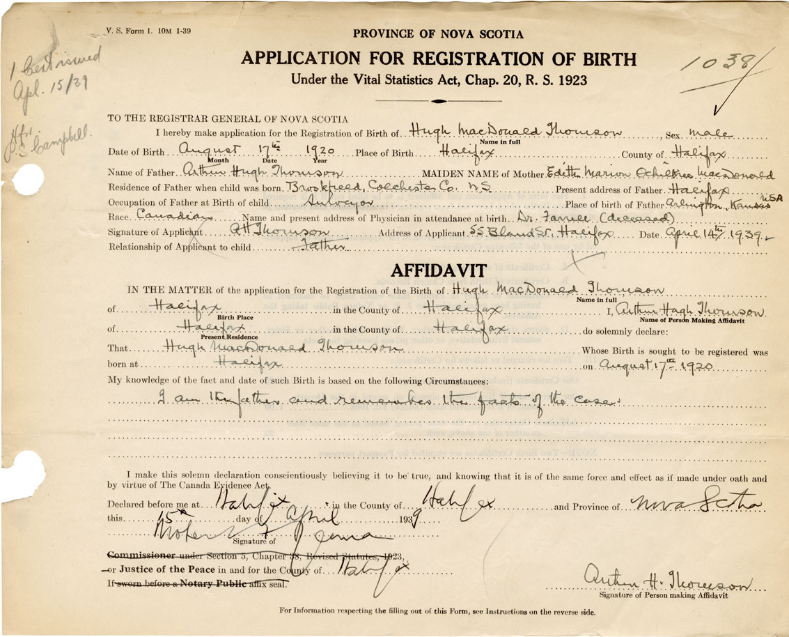 Signature of Applicant A. H. Thomson Address of Applicant 55 Bland Street, Halifax Date 14 April 1939