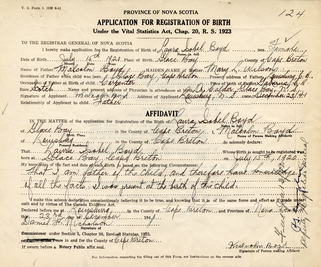 born at Glace Bay Cape Breton County on July 15, 1920