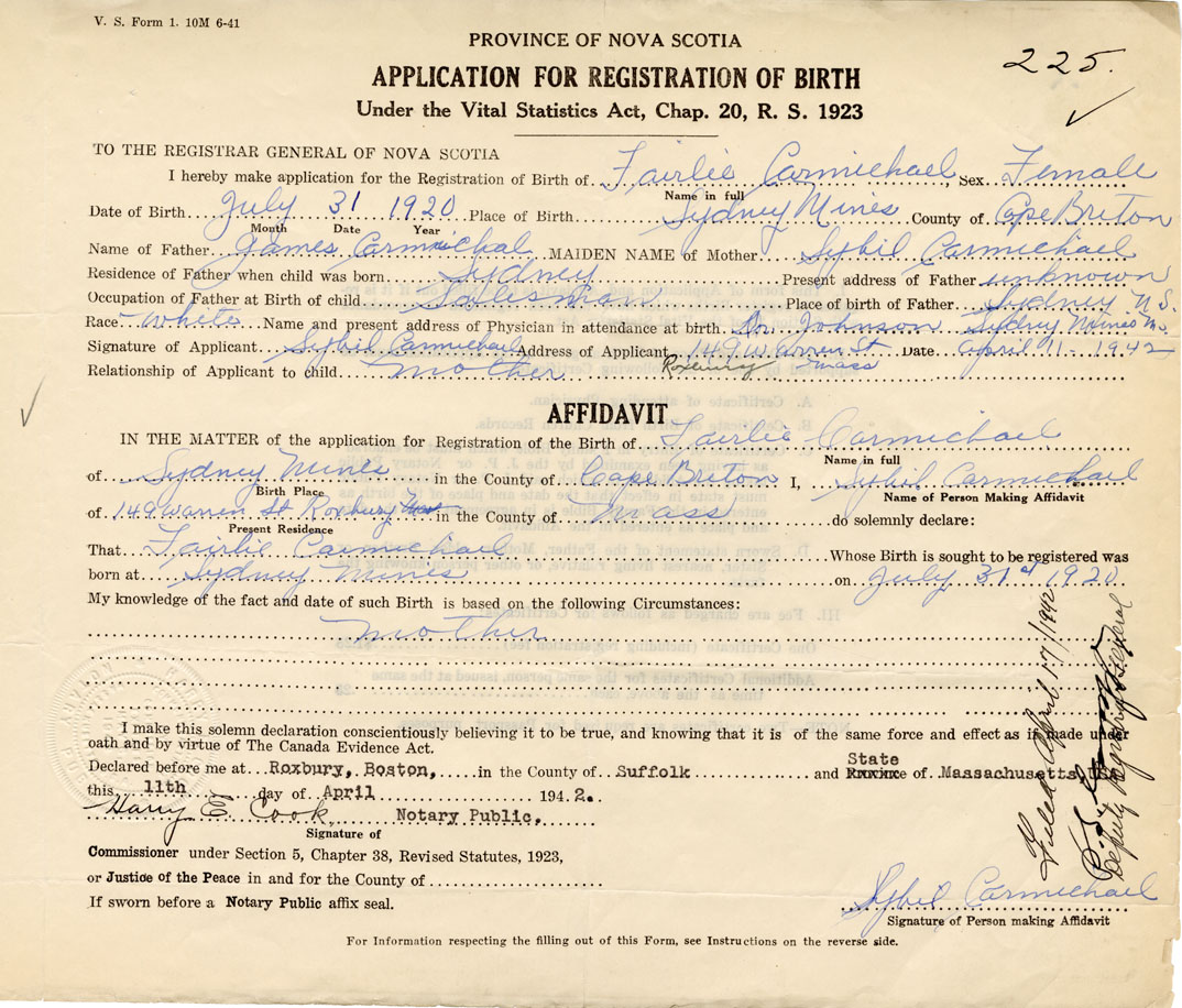 Date of Birth July 31, 1920 Place of Birth Sydney MinesCounty of Cape Breton