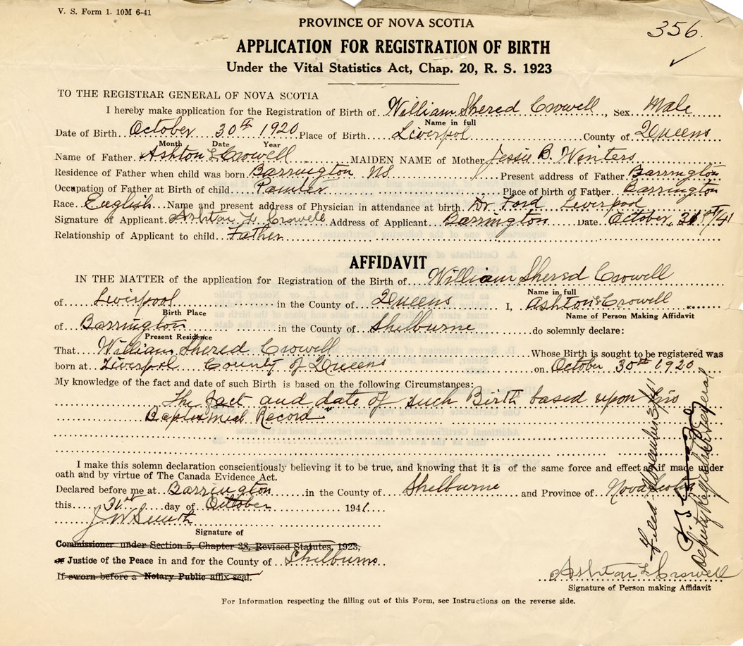 Signature of Applicant Ashton L. Crowell Address of Applicant Barrington, Queens Co. Date 31 October 1940