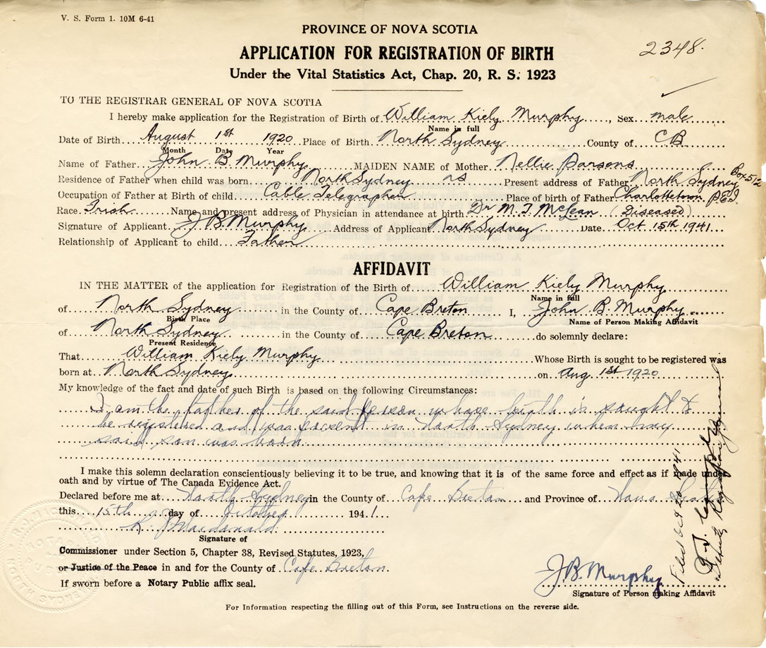 born at North Sydney Cape Breton County on August 1, 1920