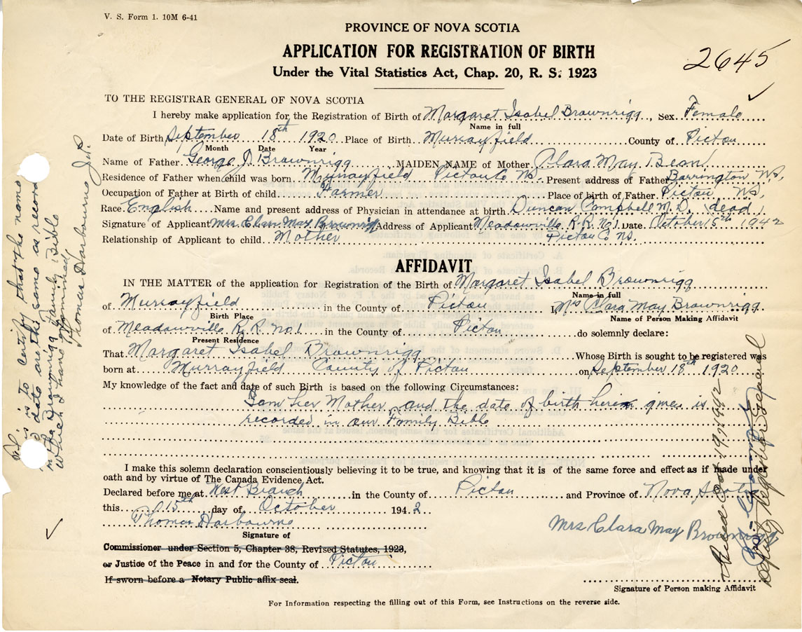 Signature of Applicant Mrs. Clara May Brownrigg Address of Applicant Meadowville, RR 1, Pictou Co. Date 15 October 1942