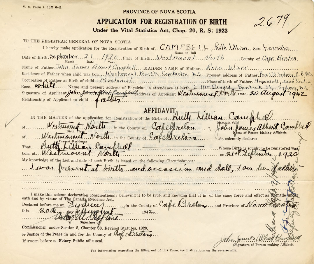 Date of Birth September 21, 1920 Place of Birth Westmount NorthCounty of Cape Breton
