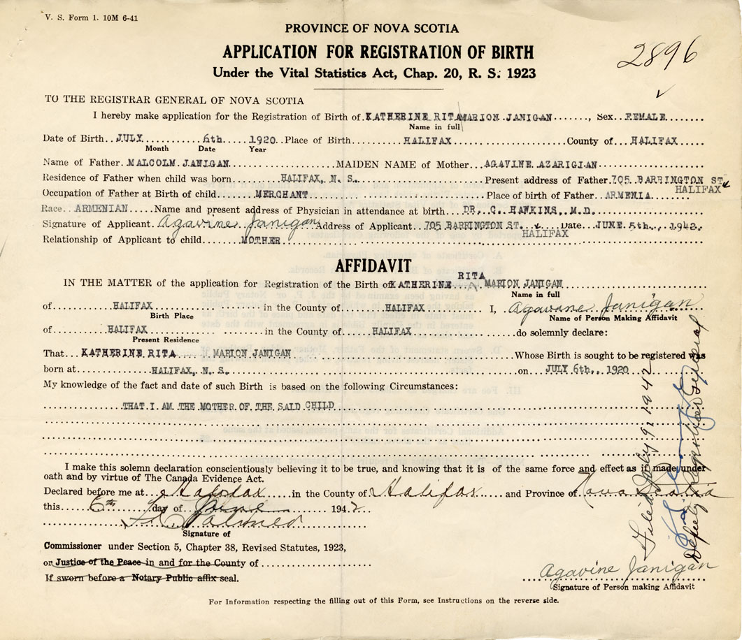 Signature of Applicant Agavine Janigan Address of Applicant 705 Barrington Street, Halifax Date 5 June 1942