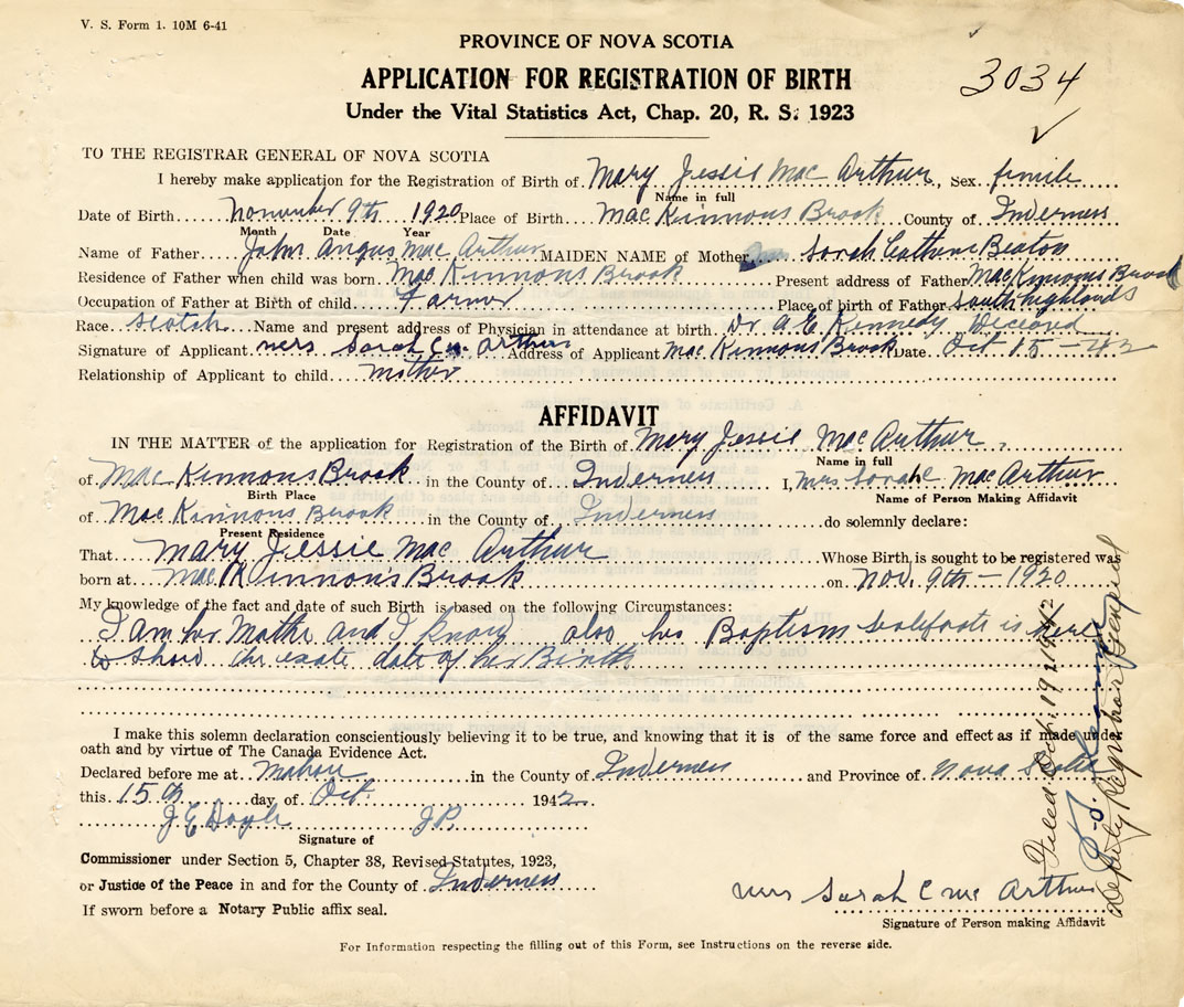 Signature of Applicant Mrs. Sarah C. McArthur Address of Applicant MacKinnon's Brook, Inverness Co. Date 15 October 1943