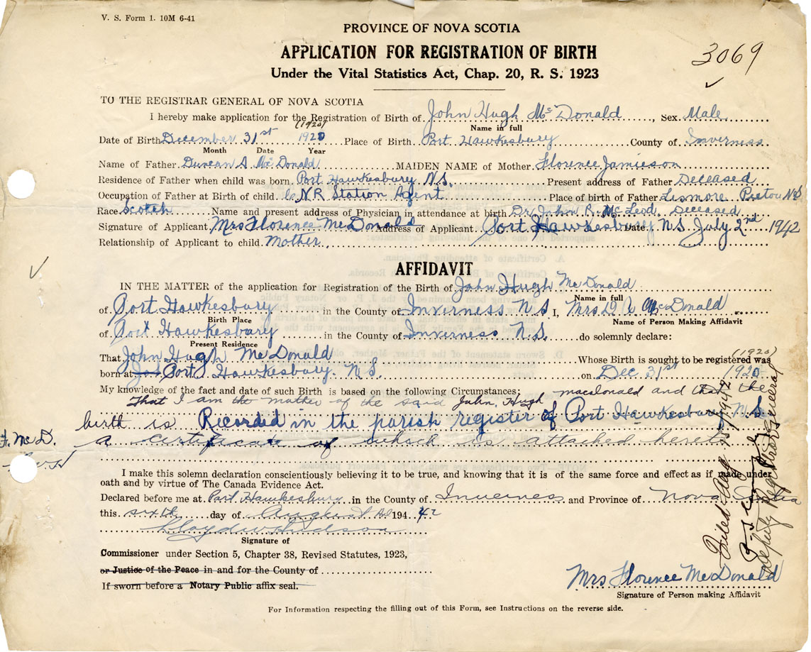 that I am the mother of the said John Hugh McDonald and that the birth is recorded in the parish register of Port Hawkesbury, a certificate of which is attached hereto.