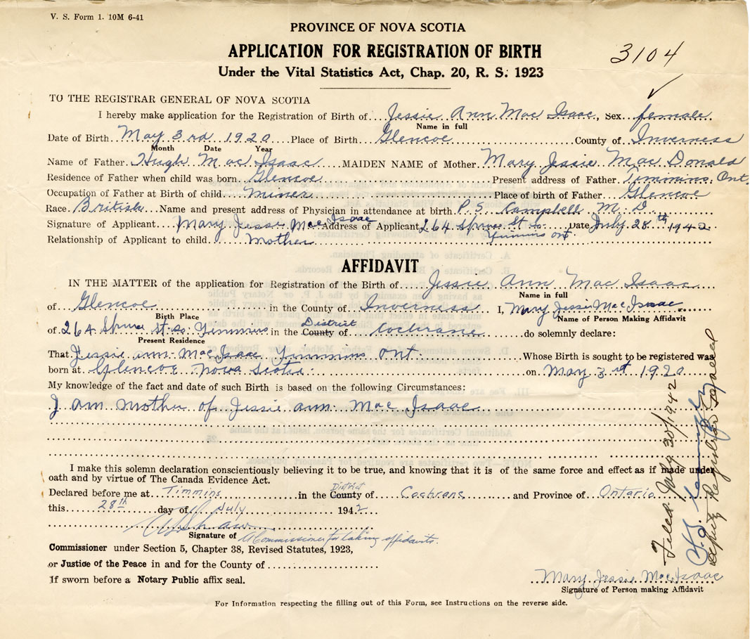 Name of Father Hugh MacIsaac MAIDEN NAME of Mother Mary Jessie MacDonald