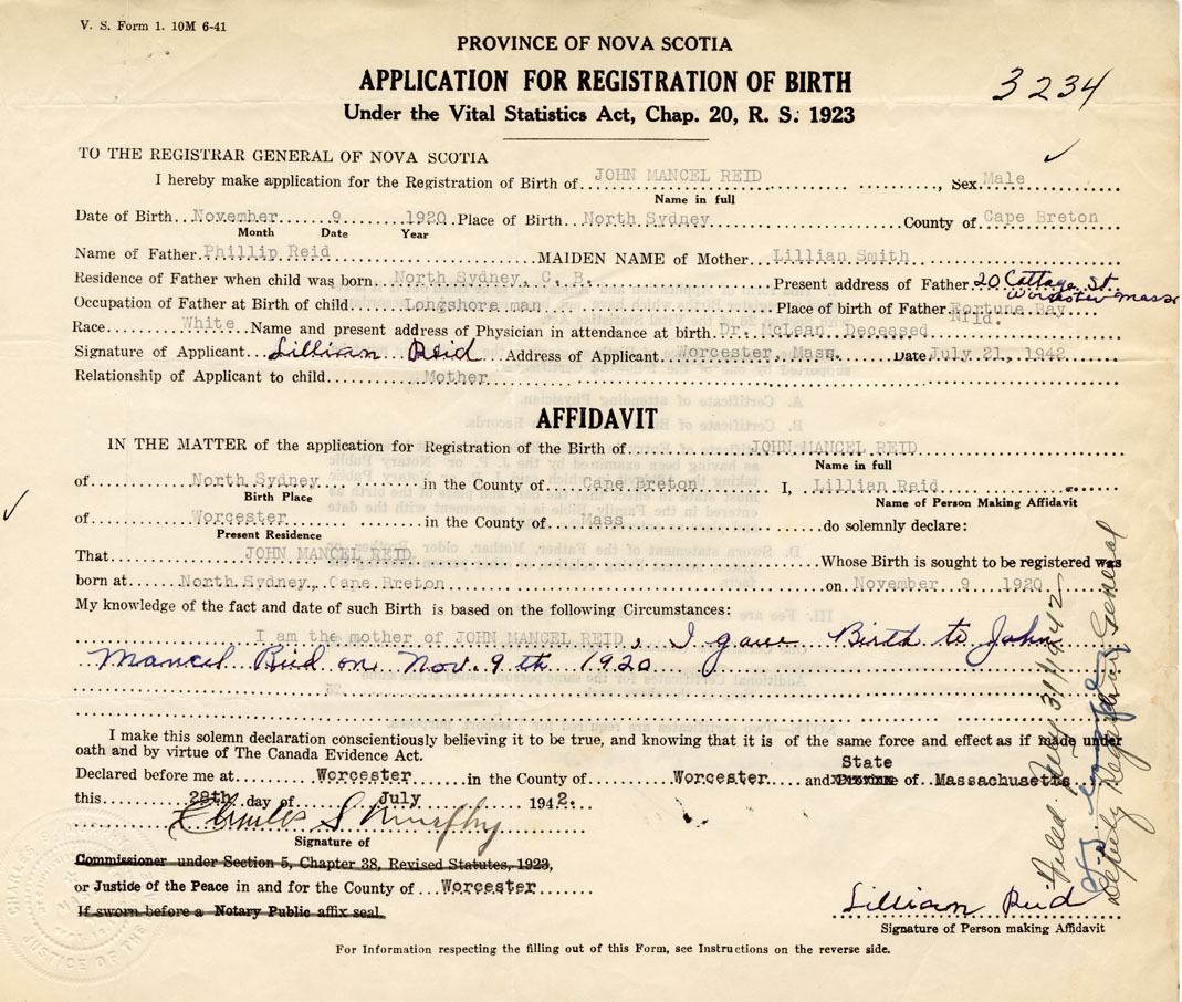Residence of Father when child was born North Sydney, Cape Breton Co. Present address of Father 20 Cottage Street, Worcester, Massachusetts, USA