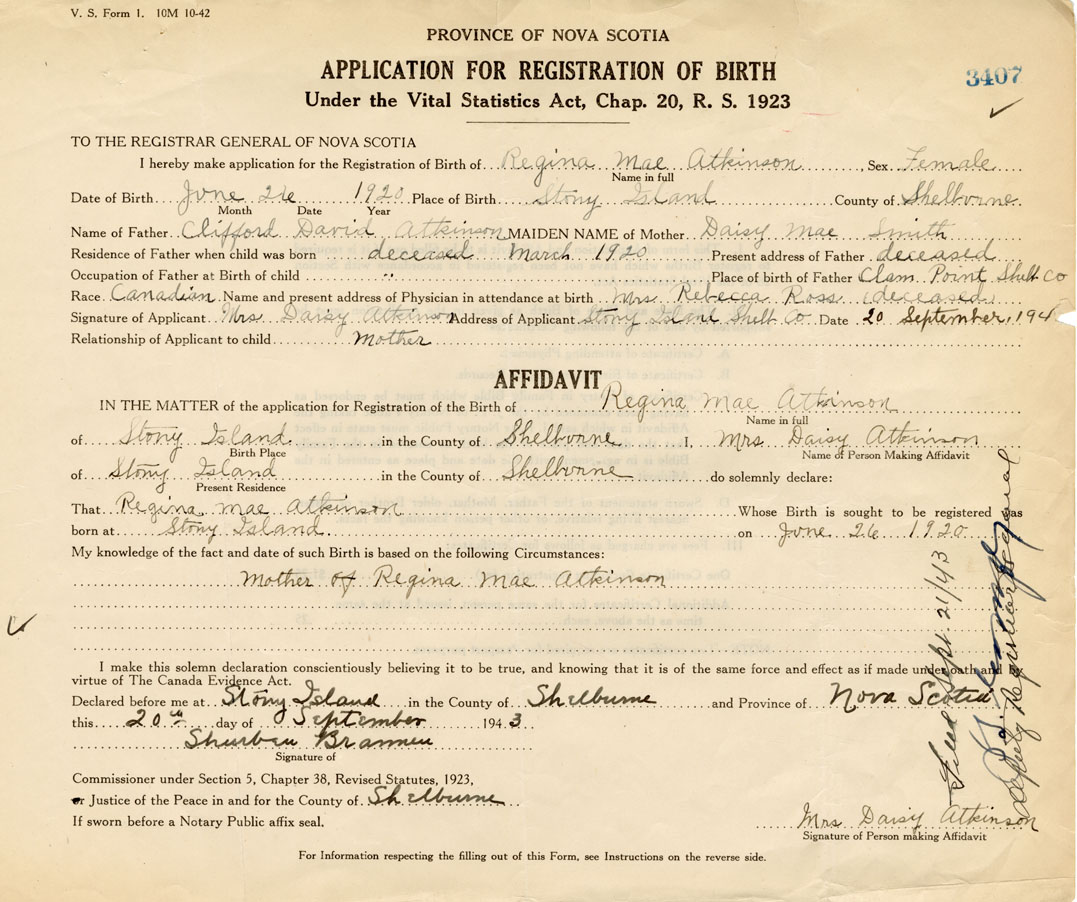 I hereby make application for the Registration of Birth of Regina MaeAtkinson Sex Female
