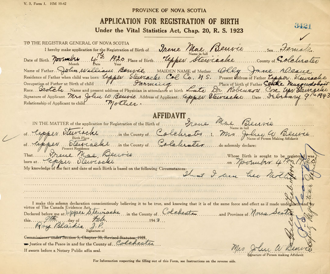 Date of Birth November 4, 1920 Place of Birth Upper StewiackeCounty of Colchester