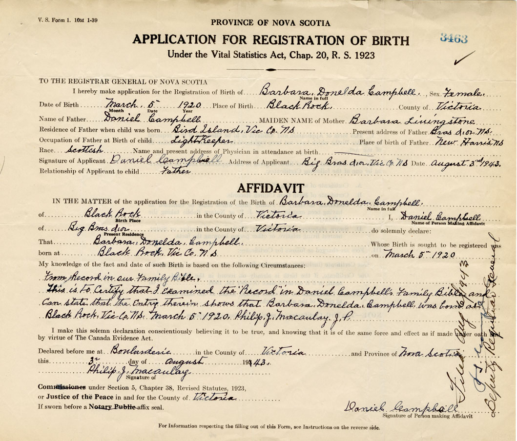 From record in our family bible. This is to certify that I examined the record in Daniel Campbell's family bible and can state that the entry therein shows that Barbara Donelda Campbell was born at Black Rock, Victoria County , March 5th, 1920. Signed Philip J. MacAulay, Justice of the Peace