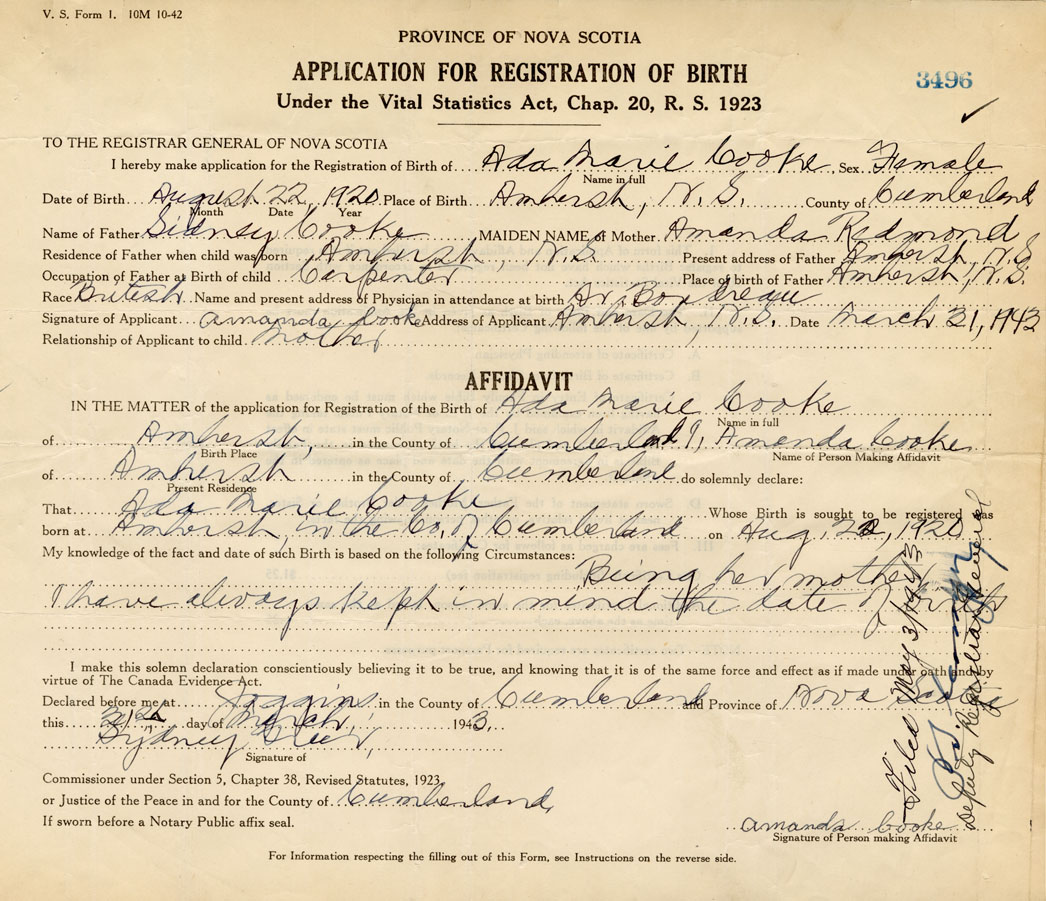 Signature of Applicant Amanda Cooke Address of Applicant Amherst, Cumberland Co. Date 31 Maarch 1943