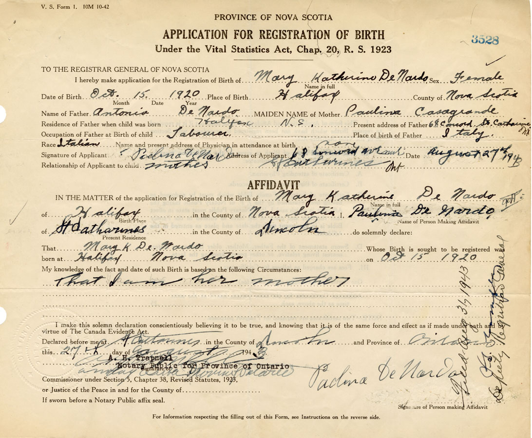 Signature of Applicant paulina DeNardo Address of Applicant 68 Concord Avenue, St. Catharines, Ontario Date 27 August 1943