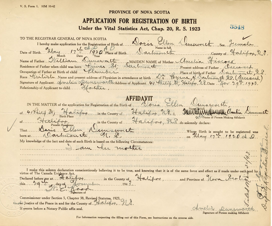 IN THE MATTER of the application for the Registration of the Birth of Doris EllenDunsworth