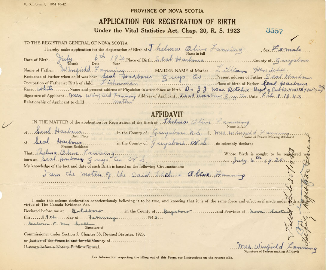 Date of Birth July 6, 1920 Place of Birth Seal HarbourCounty of Guysborough