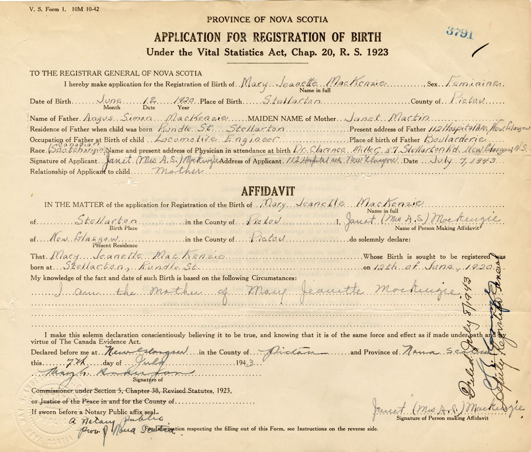 IN THE MATTER of the application for the Registration of the Birth of Mary JeanetteMacKenzie
