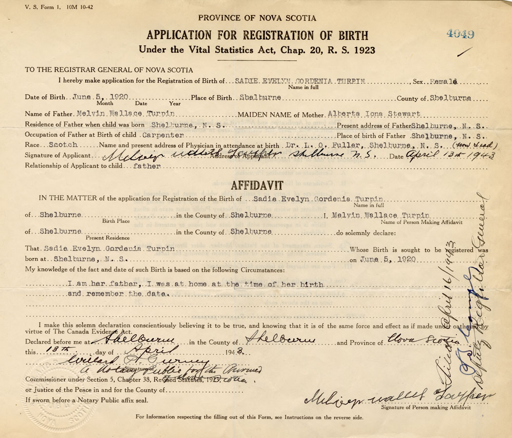 I hereby make application for the Registration of Birth of Sadie Evelyn GordeniaTurpin Sex Female