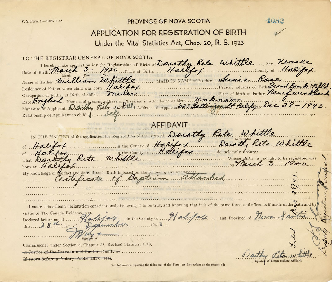 Signature of Applicant Dorothy Rita Whittle Address of Applicant Halifax Date December 28, 1943