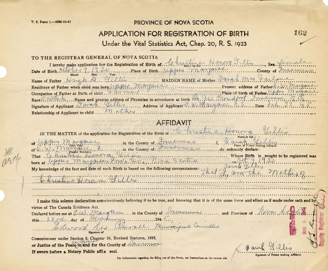 IN THE MATTER of the application for the Registration of the Birth of Christina HonoraGillis