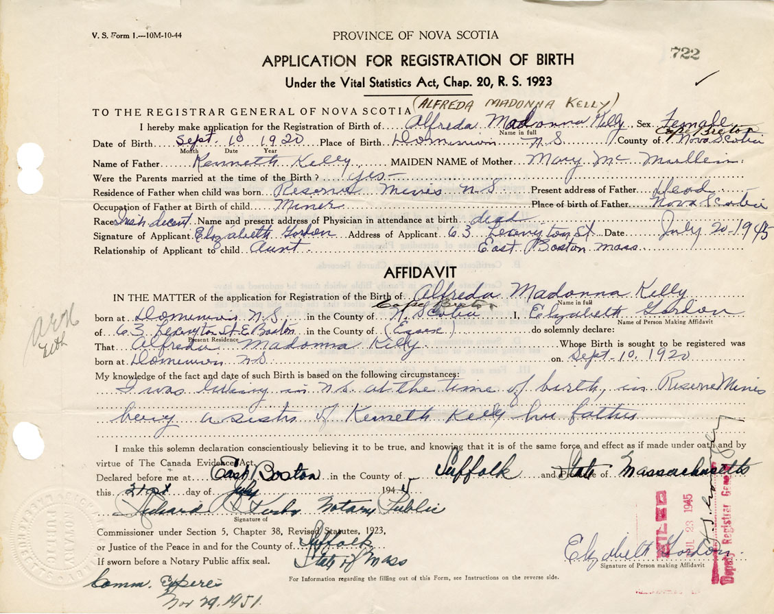 I was living in Nova Scotia at the time of birth in Reserve Mines - being a sister of Kenneth Kelly, her father