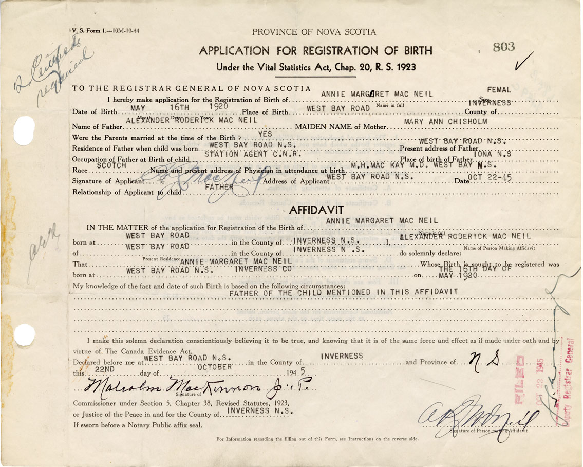 IN THE MATTER of the application for the Registration of the Birth of Annie MargaretMacNeil