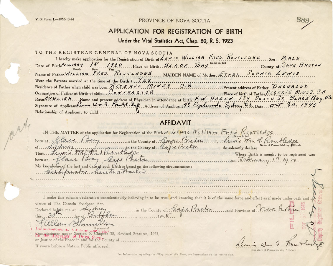 I hereby make application for the Registration of Birth of Lewis William FredRoutledge Sex Male