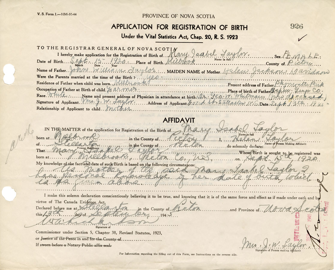 Date of Birth September 15, 1920 Place of Birth MillbrookCounty of Pictou