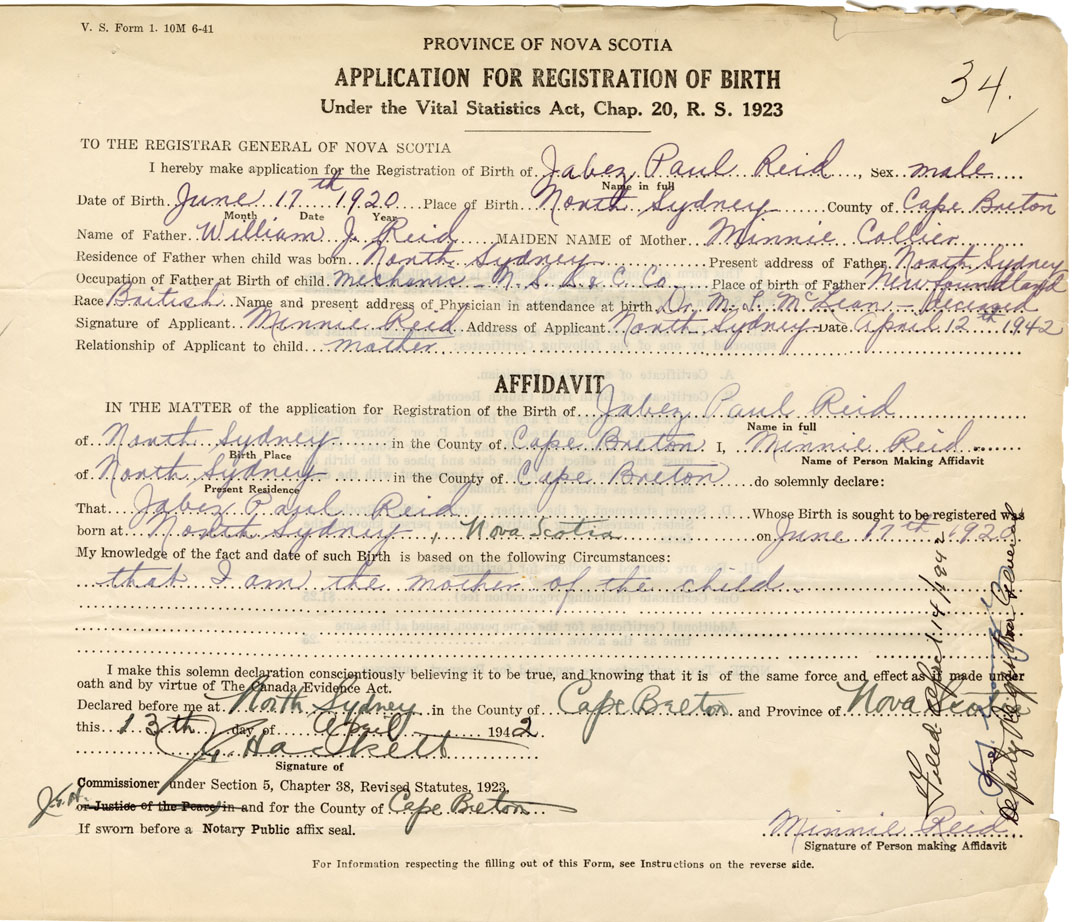 Date of Birth June 17, 1920 Place of Birth North SydneyCounty of Cape Breton